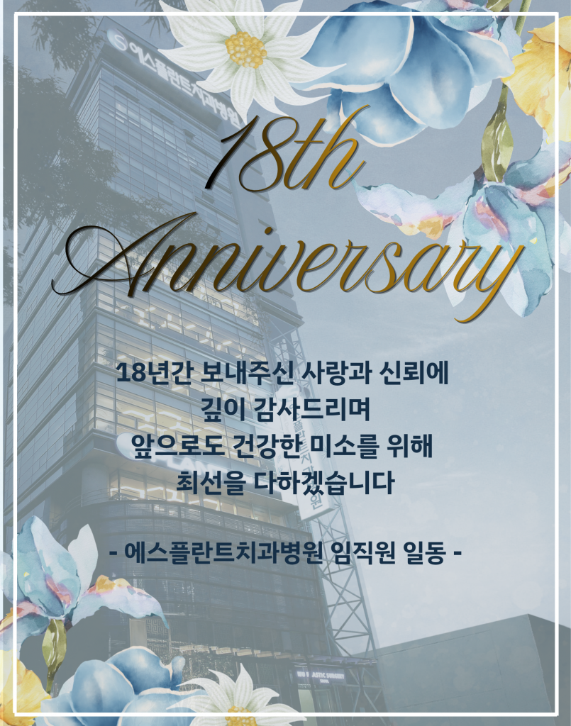 18년이라는 시간 동안 보내주신 믿음과 응원에 다시 한 번 진심으로 감사드리며, 앞으로도 에스플란트치과병원은 정직하고 신뢰할 수 있는 진료와 한결같은 마음으로 여러분의 구강 건강을 위해 최선을 다하겠습니다.
